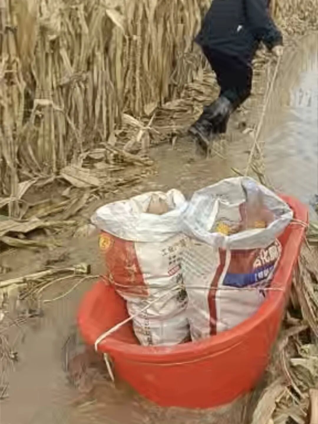 一个红色大澡盆中装着两袋刚摘的玉米,澡盆由一条绳子交叉绑住,再由一农民从一头牵着走。农民穿着雨鞋,田地间的积水没过脚踝,澡盆半浮在两块田间的沟渠中,像一条小舟驶向地头。